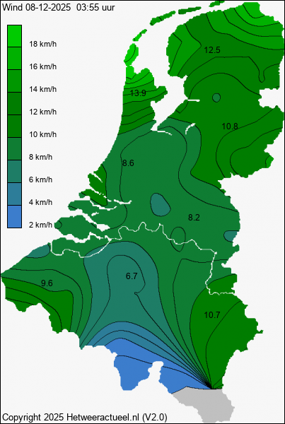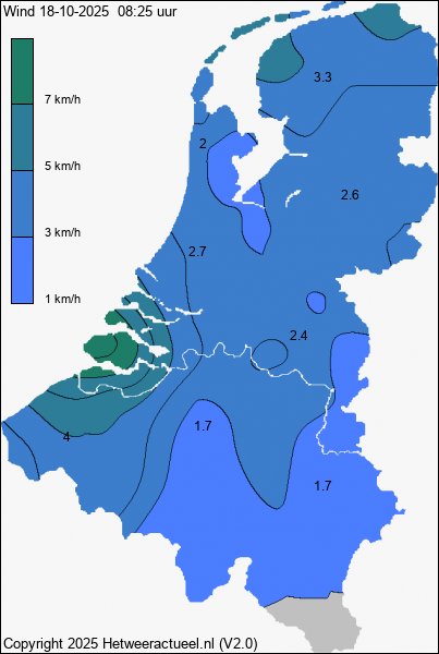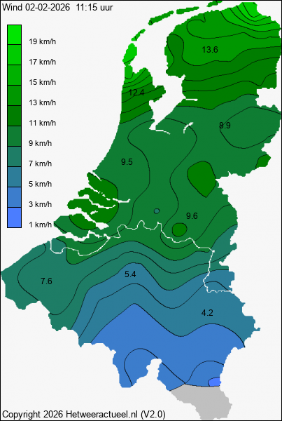 The map with the actual windspeed (10 minute average) is constructed 2 times per hour from the current data from all weather stations, provided that the data is less than 1 hour old.